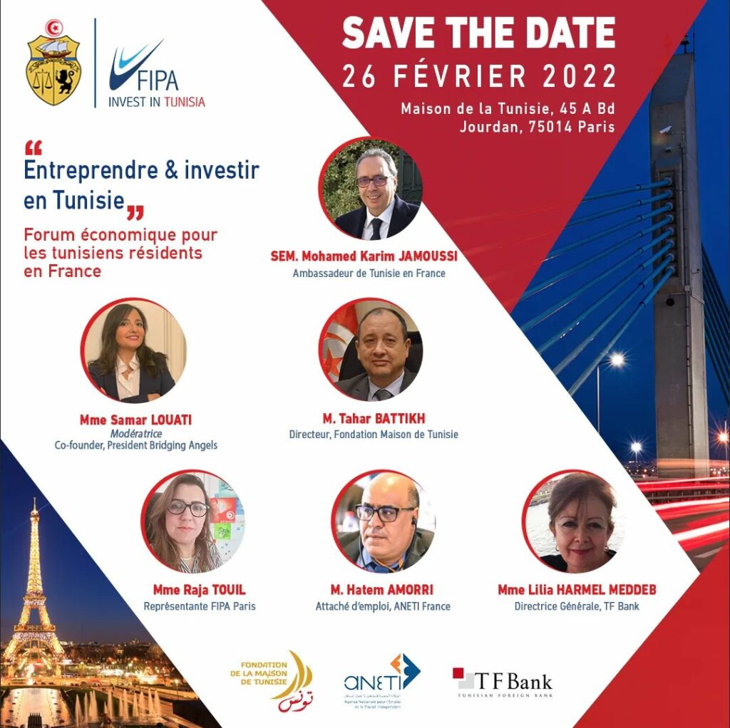 L’Agence de Promotion de l’Investissement Extérieur (FIPA) organise, le 26 février 2022 à la Maison de la Tunisie à Paris (en France), un forum destiné aux Tunisiens résidents en France, sur la thématique “Entreprendre et investir en Tunisie : structures et mécanismes d’accompagnement”.
